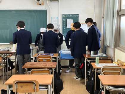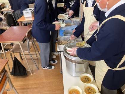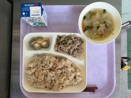 3月最初の日のメニューは「かやくご飯・豚肉と野菜の炒めもの・すまし汁・黄な粉蓬(よもぎ)団子・牛乳」の5品です。