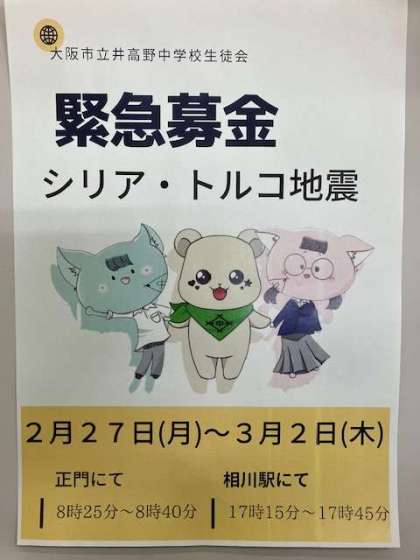2月27日(月)〜3月2日(木)まで、生徒会執行部と有志の人たちで、トルコ・シリア地震被災者支援のための緊急募金活動を朝は正門で、夕方は阪急相川駅前で行いました。