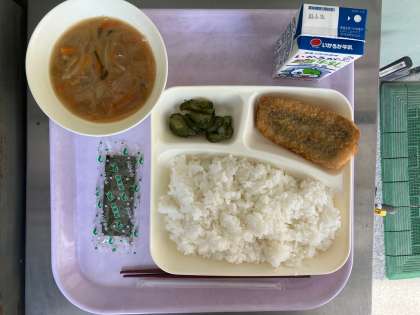 今日のメニューは「鰯フライ・味噌汁・胡瓜の赤紫蘇和え・焼き海苔・ご飯・牛乳」の6品です。