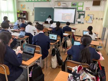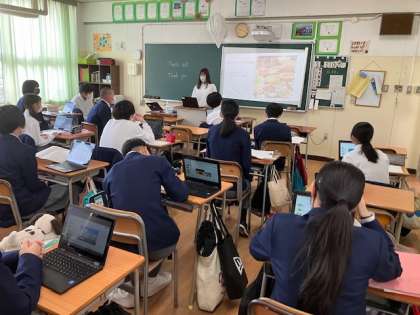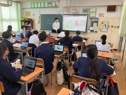 前に行き先を決めた修学旅行の英語プレゼンをしています。