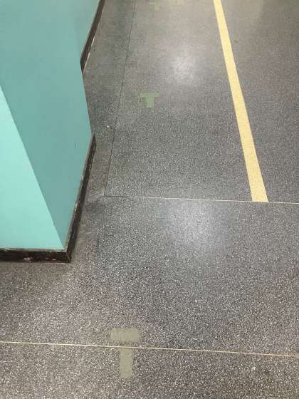3年前に臨時休業が続いたころ、教科書や課題配布で登校してもらったとき、感覚をわかりやすく確保するために張ったテープの跡です。