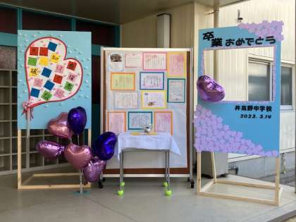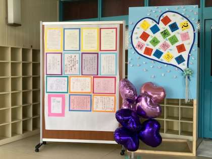 体育館前には頂戴した祝電・祝詞の掲示とPTAの皆さんが作ってくださったパネルボードが飾られて祝福ムードを盛り上げてくださいました。