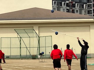 バーを持つ先生は身長が180cm以上あり、メディシンボールを高く投げるのは大変です。