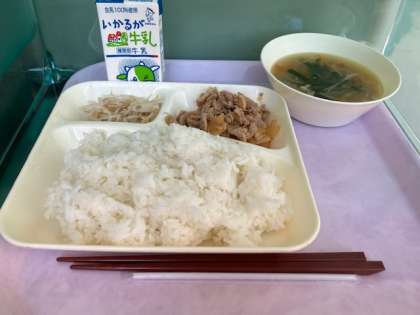 今日のメニューは「豚肉のコチジャン炒め・鶏肉とはるさめのスープ・もやしのナムル・ご飯・牛乳」の5品です。