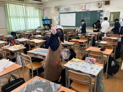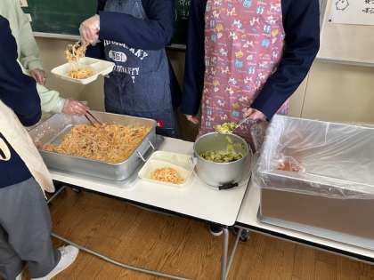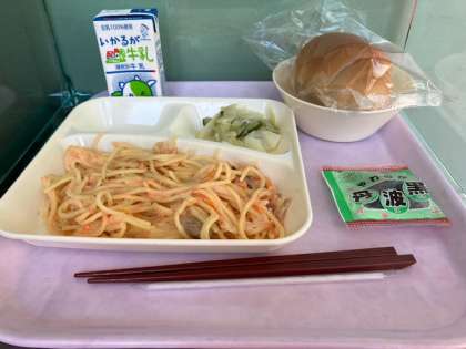 今日のメニューは「鮭のクリームスパゲッティ・キャベツときゅうりのサラダ・ソフト黒豆・黒糖パン(1/2)・牛乳」の5品です。