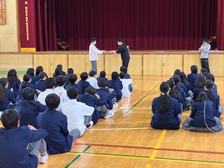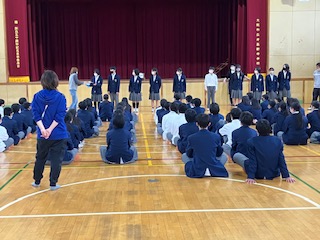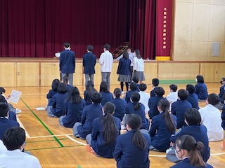 写真上)英語単語選手権で満点をとった皆さんです。英語の賞状が渡されました。