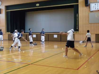 あいにくの雨天だったために、体育館で生徒中心に取り組みました。まずは小学生の緊張感を取り除くために、野球部名物「全力じゃんけん」を自己紹介を兼ねてジェンガ形式で行い、「勝ったら本気で喜ぶ練習、負けたら本気で悔しがる練習」を行い。慣れてきてから30分ほどプラスチックボールとバドミントンンのシャトル打ちを行いました。野球部は野球の練習で技術の向上のみならず、「人前力」の向上も行いますので、その体験になったと思います。入部してもらったら、今やっているさまざまな練習をどうやって伝えようかとわくわく話し合う、たくましくほほえましい部員たちの姿がありました。