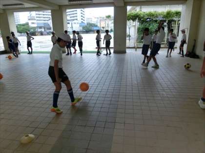 サッカー部はピロティ−で活動をしました。13人の小学生と一緒にトレーニングを行いました。中学生と一緒に声を合わせて、元気よく楽しそうに体験してくれていました。和やかな雰囲気でコミュニケーションを取り合う姿が多く見られました。