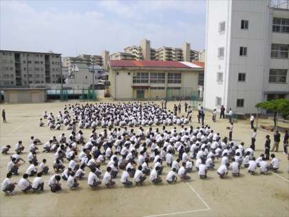 9月4日(金)大阪府の880万人訓練に参加しました。今までの避難訓練では、6時間目に担任の教員が教室から引率・誘導する避難訓練を実施していました。今回は、11時3分のエリアメールに合わせて地震が発生したという想定で避難訓練を実施しましたので、3時間目の授業中の教科担任が引率・誘導しました。