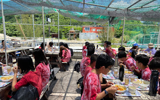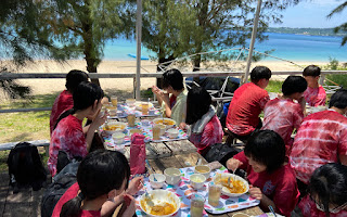 3−2は、マリンスポーツの後、青空の下で、みんなで一緒に作ったTシャツを着てカレーを頂いてます。