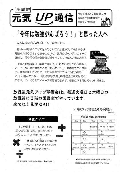 5月26日(金)には今年度初の中間の日もあります。テスト範囲の発表は1週間前ですが、普段から計画的に、ワークや課題に取り組めるといいですね!