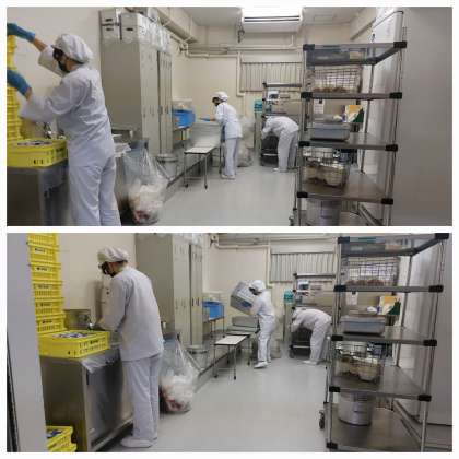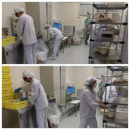 喫食後には、給食当番の生徒が配膳室まで運んでくれた配膳カートの食器や食缶を井高野小学校に返却するために、食器や残った給食を計測し搬送準備をしてくださっています。