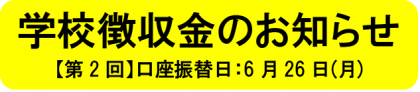 今年度第2回目(6月分)の学校徴収金の口座振替日は、6月26日(月)となっております。