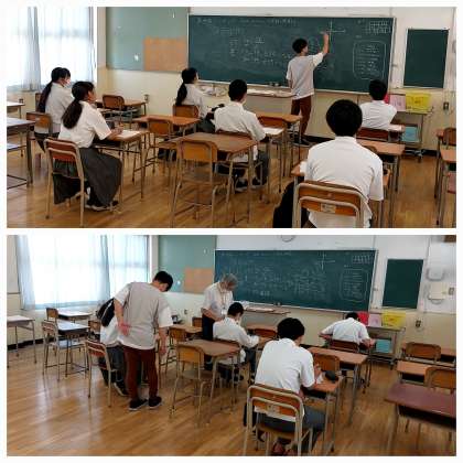 昨日参加してくれた2名の生徒さんを含む、6名の生徒さんが学習に励んでいました。1年生の復習や3年生の予習も交えながら、曲線の違いや再頻出問題について説明を聞いた後、実際に問題に取り組んでいました。