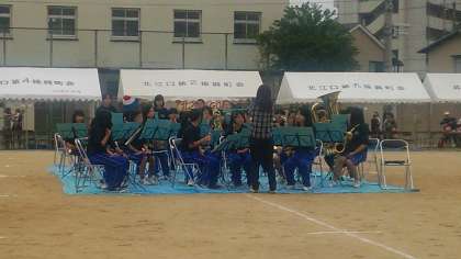 10月11日(日)井高野小学校で井高野地域の体育祭が開催されました。今年は第50回記念ということで、井高野中学校の吹奏楽部が入場行進の演奏を担当しました。