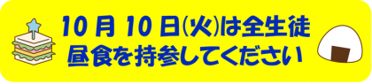 10月10日(火)は本校の給食を調理してくださっている井高野小学校が運動会による代休のため、給食の配膳がありません。全生徒昼食の持参をよろしくお願いいたします。