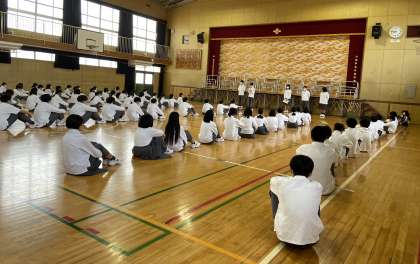 本日の集会では、1年生体育委員による体育館への入退室時の挨拶や、先輩や目上の人とすれちがう際の挨拶の仕方について、良い例悪い例が実演されました。