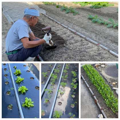 野菜の写真は左から順に「サラダ菜」「にんじん」「ほうれん草」です。暑い日が続いたため、芽の出が悪いとのことでしたが、芽が出た野菜はどれも青々と元気に育っていました。