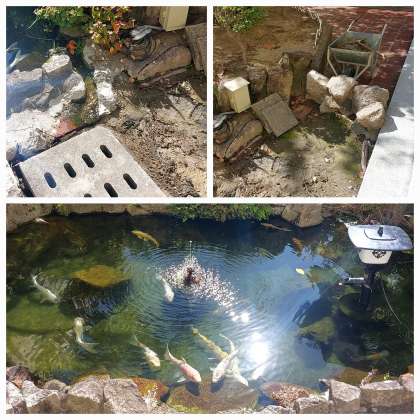 管理作業員さんが、事務室前の池の排水用水路から水が漏れていた部分を修繕してくださっていました。