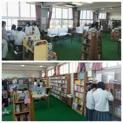 お昼の図書館開放は、図書委員の当番生徒が担当しカウンター業務や図書の整頓を行いました。来館する生徒も多く、活気ある図書館開放日となりました。