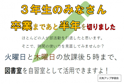 明日10月17日(火)の放課後に、元気アップ主催による放課後学習会があります。