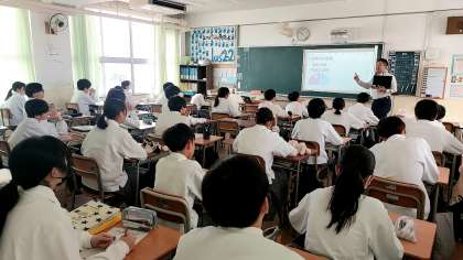 自己紹介の後に「地域の食材と郷土料理」について授業を行いました。クイズを交えながら、行事食の由来や、なぜその時期にそのような行事が行われるのか説明しました。