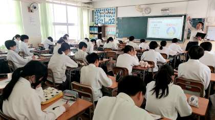 昨日の1年生と同様に、2年生でも療養中の家庭科教諭に代わり、教科担当許可を得た教頭が家庭科授業を行いました。