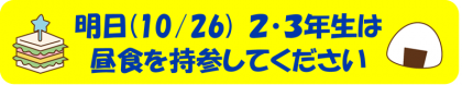 なお、明日(10/26)は、2・3年生は合唱コンクールのため給食はありませんので、昼食をご持参ください。1年生は給食があります。