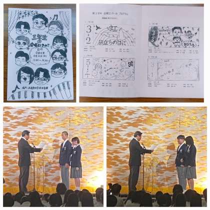 同じく合唱の後、審査・集計が行われ、音楽科の先生から講評をいただきました。最後に、学年主任の先生から最優秀賞のクラスが発表され、優秀賞に選ばれた3年4組と最優秀賞に選ばれた3年3組の代表生徒が校長先生から賞状を受け取りました。明日の文化祭では、3年生を代表して、最優秀賞に選ばれた3年3組が合唱を発表します。