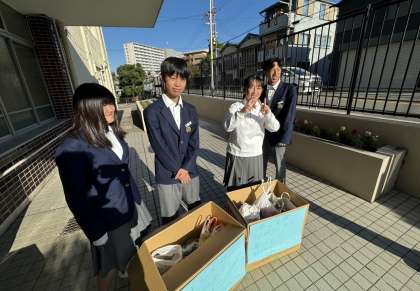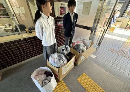 本日10月31日に、本校の生徒会生徒が、東井高野小学校の登校時間に「届けよう、服のチカラプロジェクト」のための子ども服回収と、あいさつ運動を行いました。