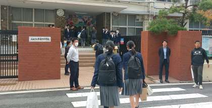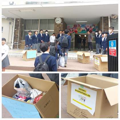 本日の登校時間に本校正門にて、前期生徒会と後期生徒会の生徒が合同で「届けよう服のチカラプロジェクト」のための子ども服回収を行いました。朝のあいさつ運動にあわせ、登校した生徒に子ども服回収の声掛けをしました。