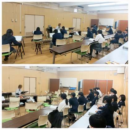 本日は、講師の先生による箏の授業2日目でした。2年2組の生徒が、2グループに分かれ3時間目と5時間目にご指導いただきました。