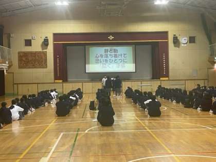 体育館でみんな心を1つに先生の話を聞いて、強い絆をもって楽しく安全に行動できる思いでいっぱいの1日にしましょう!!