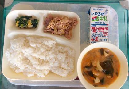 本日の給食では、地産地消の一つとして、大阪で栽培収穫された「きくな」を使っています。