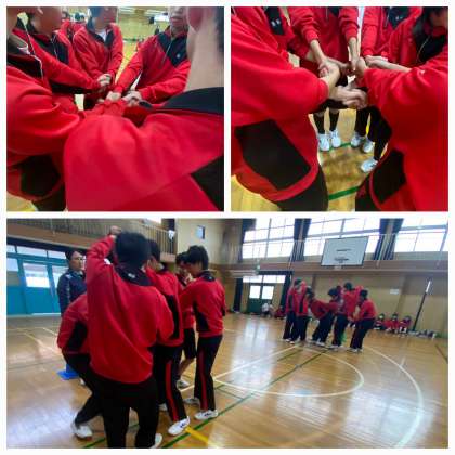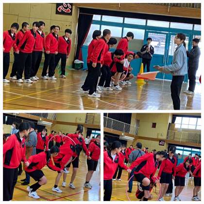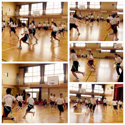 写真は、フラフープくぐり、人間知恵の輪、しっぽ取りの様子です。どの競技も、クラスで協力して取り組みました。互いに声援を送り合い、楽しいスポーツ大会になりました。