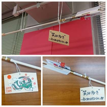 職員室に破魔矢が飾られました。絵馬には学校目標の一つでもある「笑み多き」1年でありますように!!と書かれています。破魔矢は「身にかかる災いである魔を破り、幸せに暮らせるように」という願いを込めた縁起物です。矢を射るという意味から、チャンスを射止めるご利益もあるとも言われています。