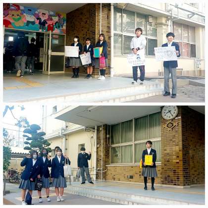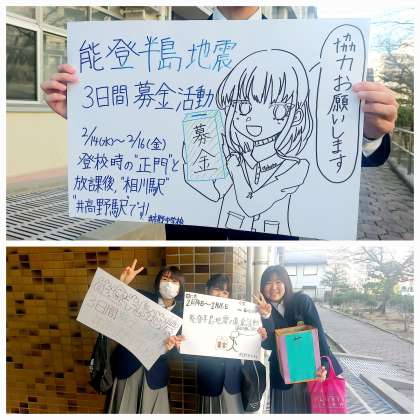 本日2月14日(水)から16日(金)まで、能登半島地震災害に関する募金活動を行っています。登校時間には、あいさつ運動とあわせて活動を行いました。放課後は、井高野駅前と相川駅前で活動予定です。
