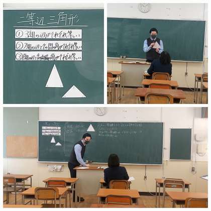 本日2時間目に、特別支援学級の生徒を対象に数学の研究授業を行いました。単元は「図形の性質と証明」で、本時の目的は「二等辺三角形の性質を学ぶ」です。
