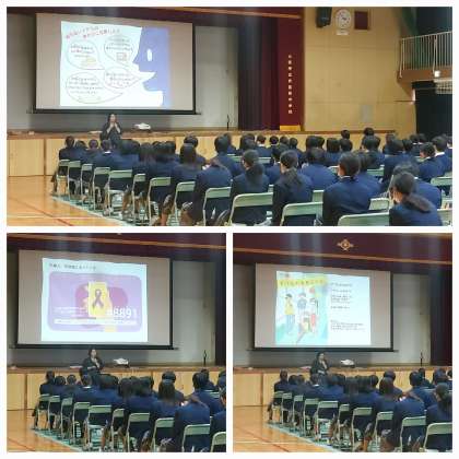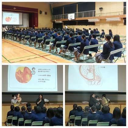また、男女それぞれのからだの仕組みや思春期のからだの変化、性行為やマナーについてお話していただき、心身ともにいのちをつなぐ準備中である生徒に向け、いのちの大切さや他者と比べることなく自分自身を大切にすることで、相手を大切に思い、互いに認め合うことができるとお話していただきました。最後に、困ったことがあった際に相談できる窓口も紹介してくださいました。
