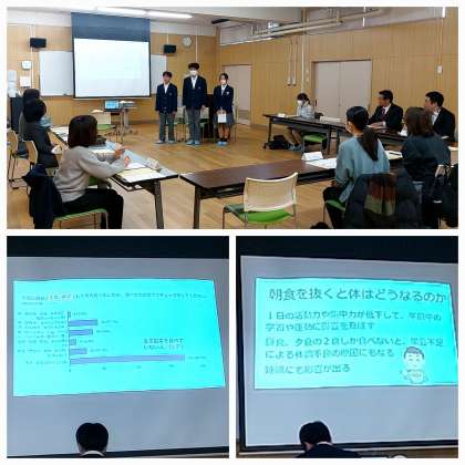 本日午後1時半より、本校多目的室にて学校保健委員会が行われました。学校薬剤師さんとPTA役員の皆様にもご参加いただき、委員会冒頭では、後期衛生委員会2年生の代表生徒によるスライド発表を行いました。発表内容は「食に関するアンケート」です。事前に全校生徒を対象に行った朝食アンケートと、その結果を受け、前期衛生委員が発案し調理実習を行った内容をまとめ発表してくれました。