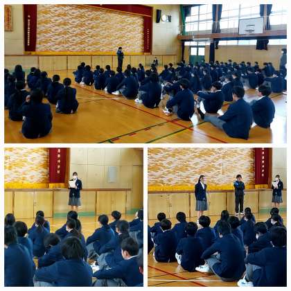 〇昨日で3日間の学年末テストが終わりました。お疲れ様でした。明日からは3月になります。2年生として最後の1カ月です。各クラスや学年での取り組みも考えていますので、協力して参加してください。また、テストは終わりましたが授業は残っています。3年生になる準備も含め、最後までしかっりと取り組んでください。