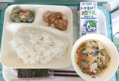 本日の給食のよもぎだんごは、うるち米ともち米、よもぎで作られています。甘い蜜をからめたよもぎだんごに、きな粉をかけて食べます。