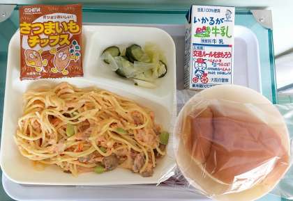 「おさつチップス」は、今回初めて給食に登場しました。うすくスライスした国産のさつまいもを油で揚げ、砂糖で甘みがつけられていました。パリパリとした食感とさつまいもの優しい甘さが美味しいチップスでした。