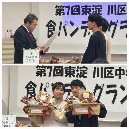 昨日3月17日(日)に、東淀川区青少年指導員連絡協議会主催の「第7回東淀川区中学生食パンデコグランプリ」が大阪成蹊大学で開催されました。本校からは、先日卒業式を迎えた3年生4名がペアを組み、「1mmダッシュファイターズ」チーム、「とんかつのきれはし」チームとして参戦しました。