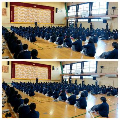 4月には学年が1つ上がります。3月31日までは、今の学年ですが、今日を区切りとし次の学年に上がる準備をしっかりとしてください。春休み中も、自分の身体や命、家族や友人の身体や命を大切に過ごしてください。外出する際は交通ルールを守り、事故や事件に巻き込まれないように気をつけてください。みんなで新学期を迎えましょう。