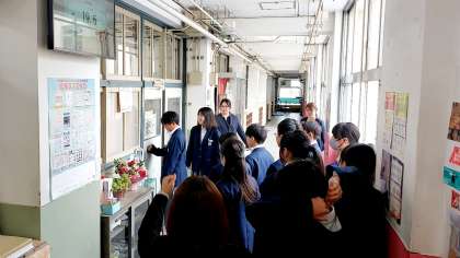 再度職員室での入室練習をする場面に出会いました。どの班の生徒も、先輩が教えてくれた通りに大きな声で名前と用件を伝え、丁寧にあいさつをしていました。こちらの班でも、代表生徒に大きな拍手が送られました。