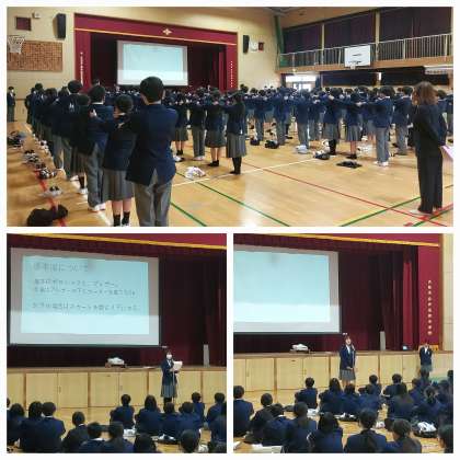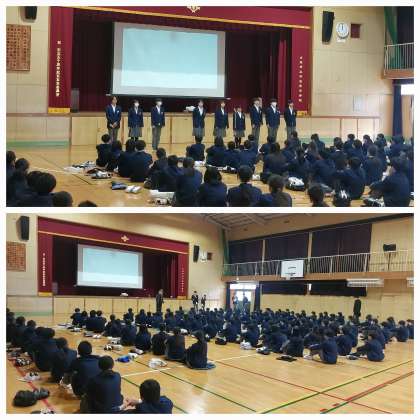 案内予定の教室を全て回った後、体育館に集合時間せ、生徒会生徒より学校ルールの説明がありました。教室の場所や学校ルールについて、一日で覚えることは難しいと思います。わからないことや困ったことがあれば、先生や先輩に尋ね、楽しくて安心安全な学校生活を送ってくださいね!