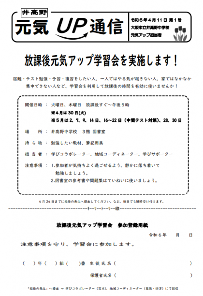 本日「元気UP通信第1号」と「放課後元気アップ学習会のお知らせ」を配布いたしました。元気UP通信第1号には、放課後元気アップ学習会の参加登録用紙がついています。ご一読いただき、ぜひご登録ください。