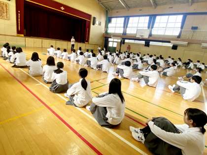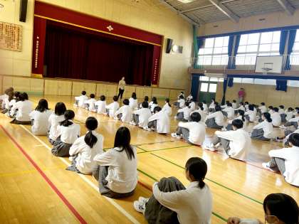 集会をしている姿を後ろから見ていましたが、皆さんの背中が大変かっこよく見えました。しっかりと話を聞いているからこそだと思います。1年生のお手本として、これからも、しっかりと話を聞くかっこいい姿勢を続けてください。