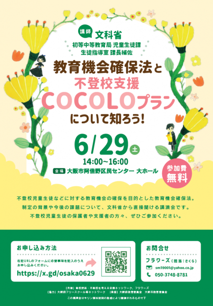 不登校児童生徒などに対する教育機会の確保を目的とした教育機会確保法と、不登校支援についての講演会の案内がありましたので、お知らせさせていただきます。